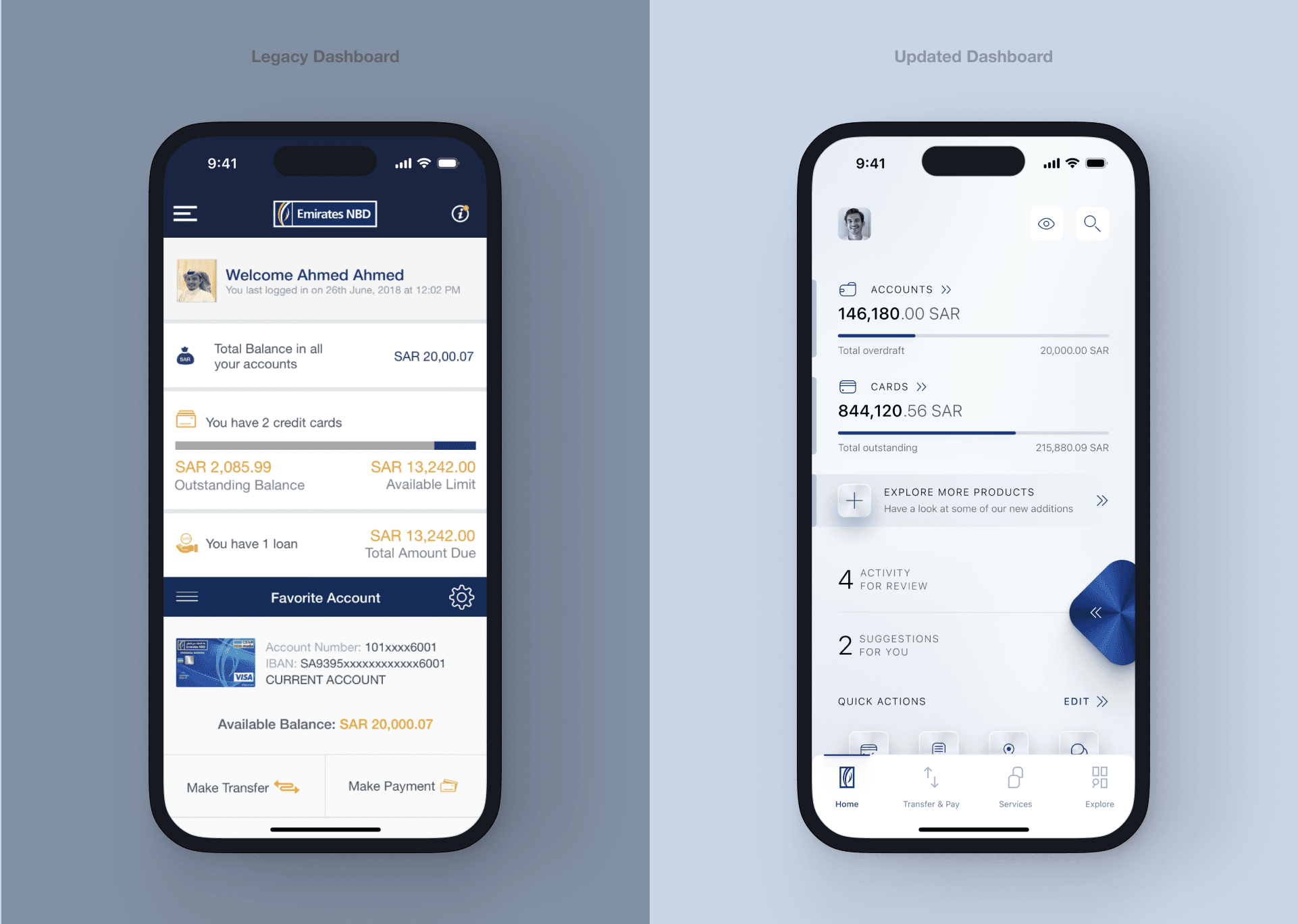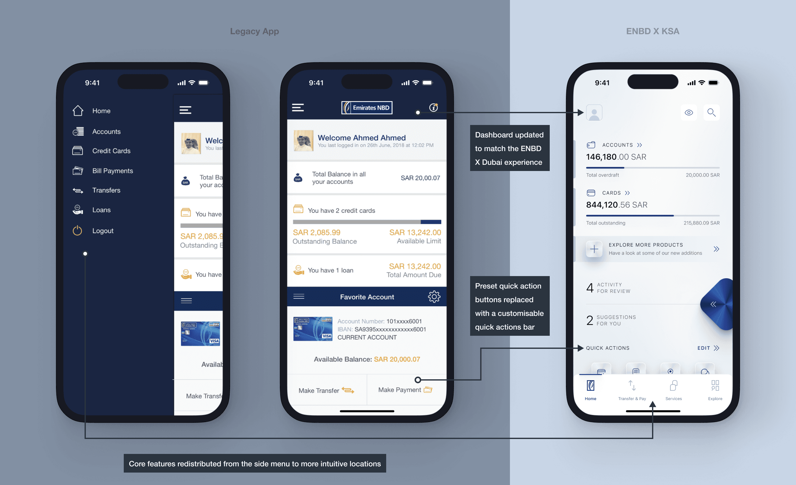 Before and after — the legacy KSA dashboard replaced with the Dubai ENBD X equivalent