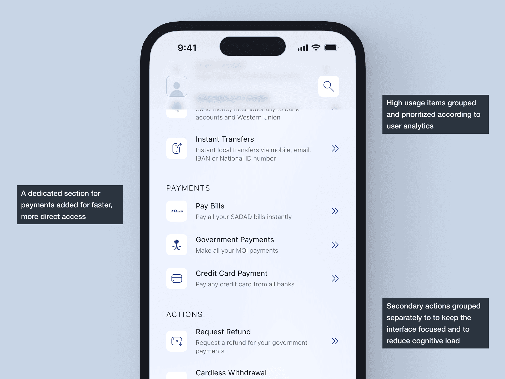 Localisation went well beyond text translation. Session analytics showed that 74% of users in Saudi Arabia primarily used the app for bill and credit card payments, so navigation was restructured to surface these actions more prominently.