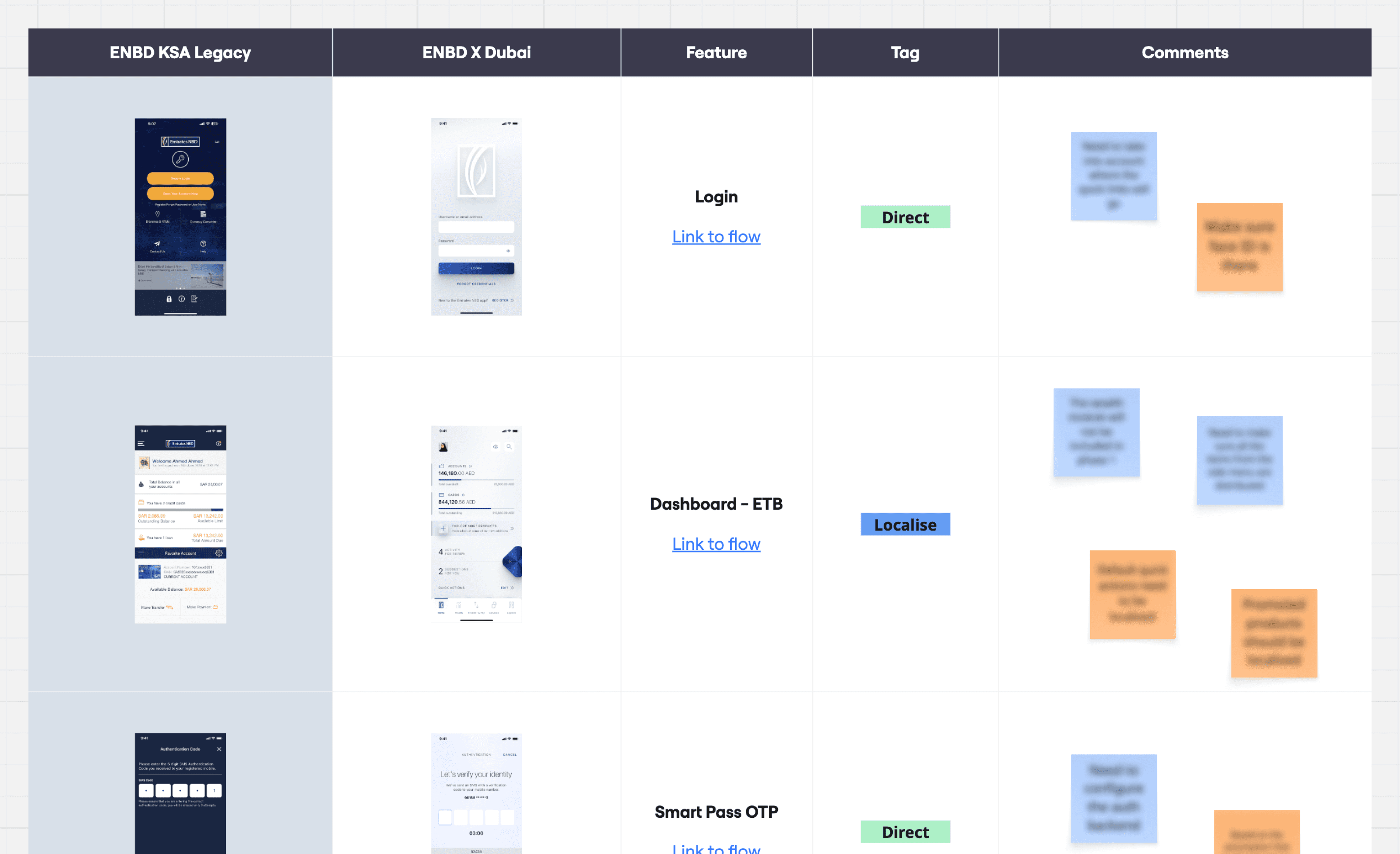 The first step was a thorough mapping of the Dubai app against the Saudi market context. Working with PM, product, engineering, and compliance teams in a series of workshops, we reviewed every screen of the legacy KSA app and the Dubai app side by side, tagging each screen as either direct (could be reused from Dubai), localisation (needed adaptation for the Saudi context), or new feature (did not exist in Dubai and had to be designed from scratch).